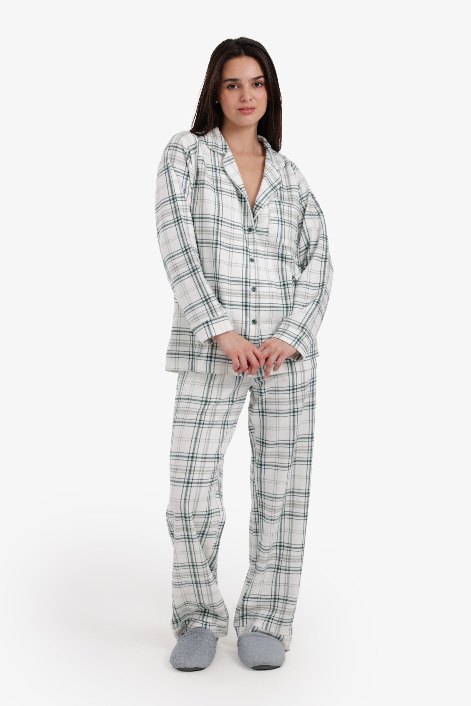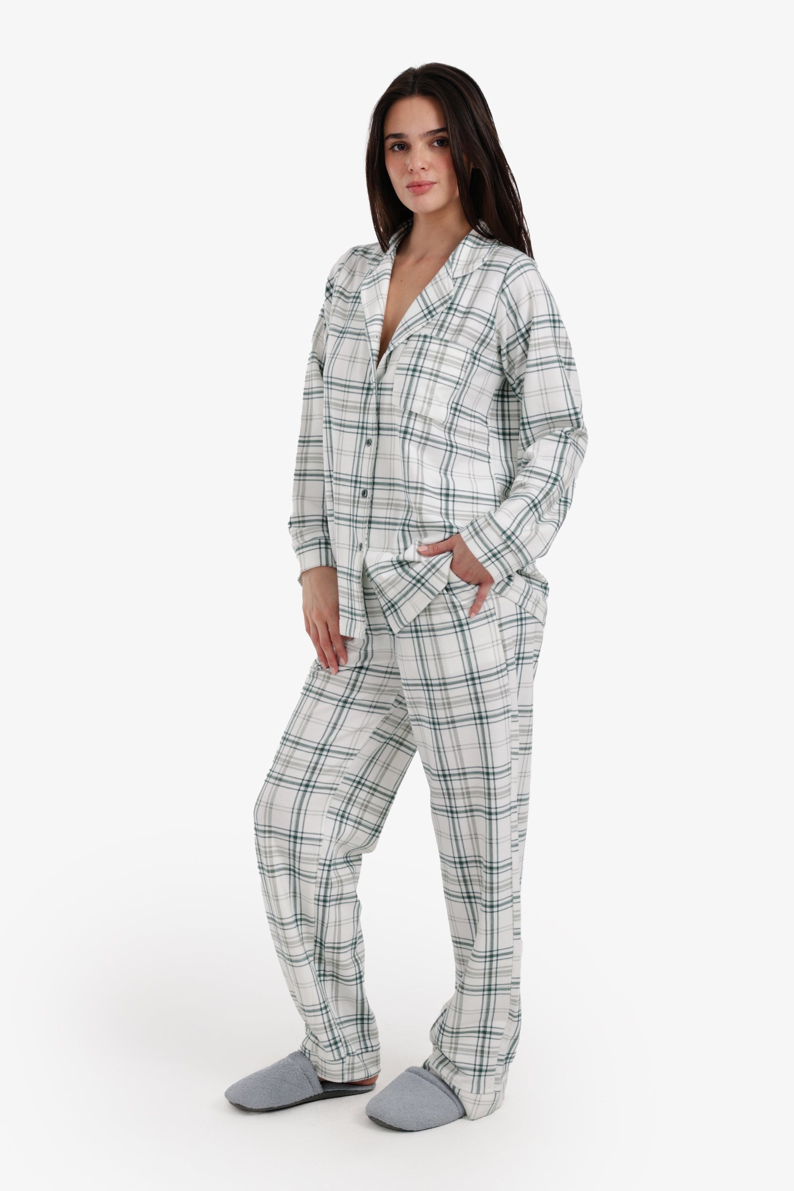 This is a classic, two-piece pajama set in warm, brushed flannel fabric featuring a timeless plaid or checked pattern. The set includes a long-sleeve button-up top with a notch collar and matching full-length pants. It is the perfect staple for warmth, comfort, and cozy winter lounging.