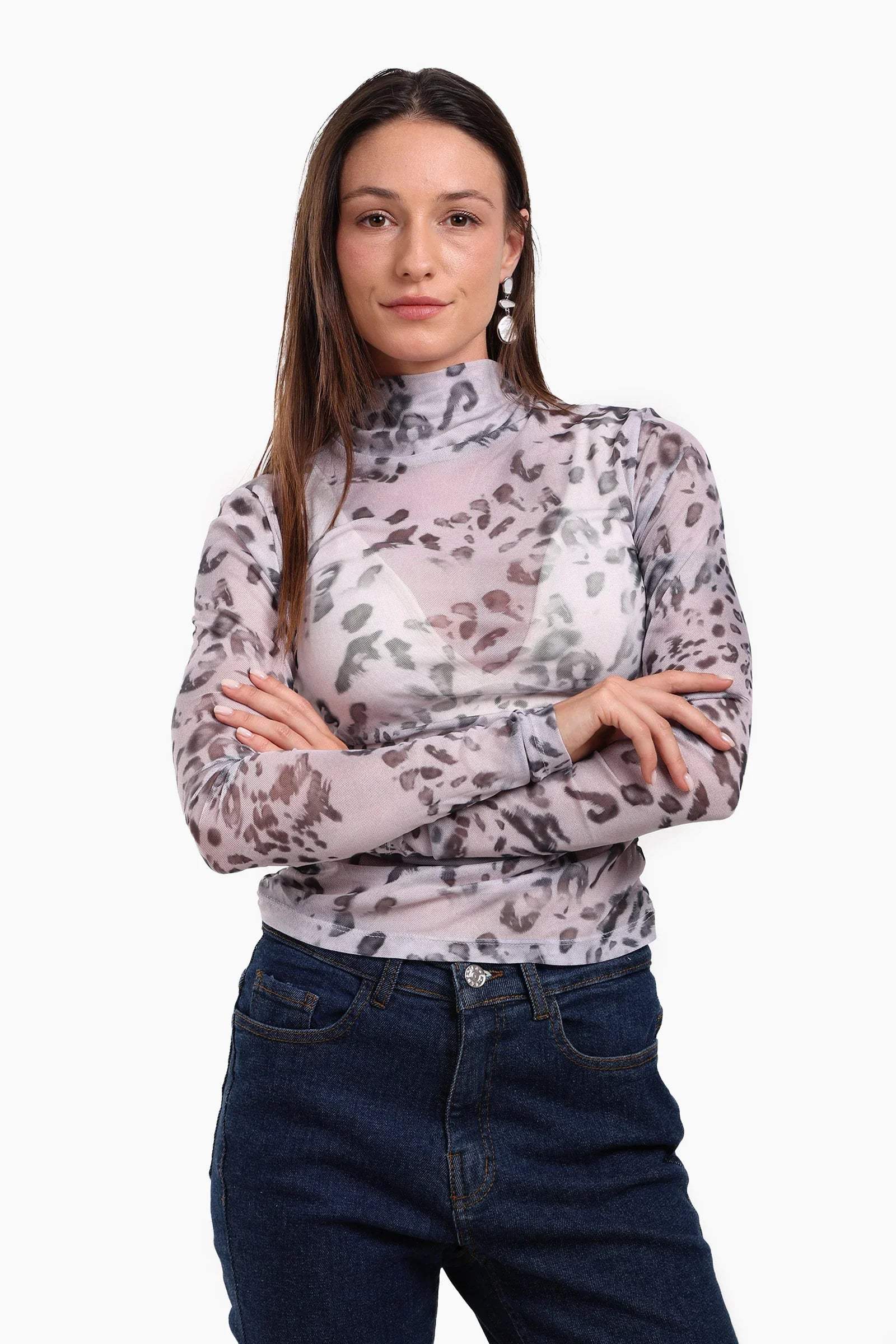 Turn heads with this bold and flattering Leopard Mesh Top, designed to bring a touch of fierce sophistication to your wardrobe. Crafted from lightweight, breathable mesh fabric, this slim-fit top hugs the body comfortably while offering just the right amount of stretch. Featuring a classic high neckline, long sleeves, and a ruched side detail, this piece adds texture and shape to your silhouette. The striking leopard print delivers a confident, fashion-forward edge, perfect for styling with high-waisted trousers, skirts, or layered under blazers for a night-out look. With its easy slip-on design, this top is both effortless and eye-catching — ideal for dressing up or down with ease.