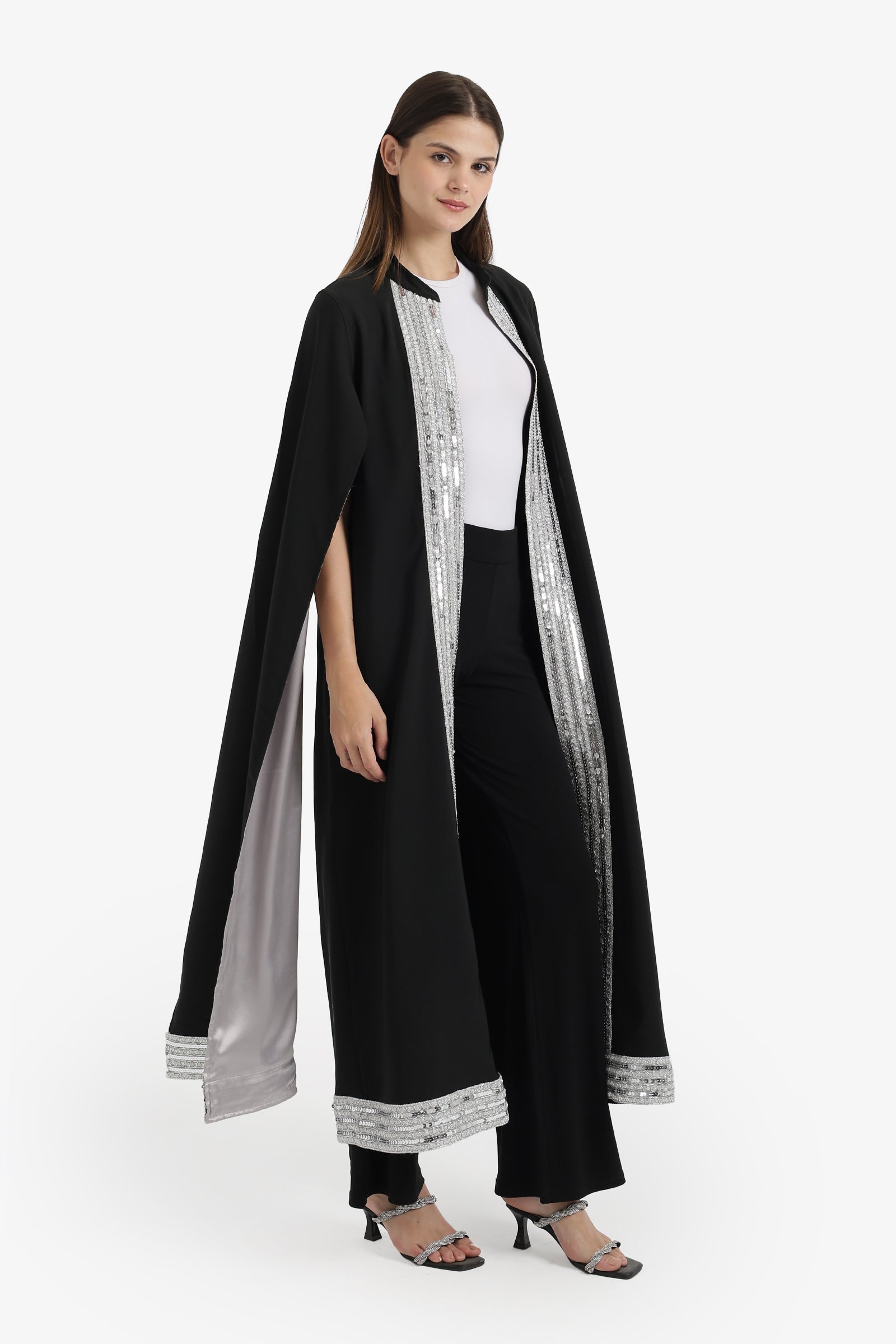 This luxurious kimono boasts a relaxed fit, a refined stand collar, and a flowing silhouette adorned with shimmering sequin trims and graceful slit sleeves. Its maxi length exudes sophistication, making it the perfect choice for Ramadan gatherings, iftar soirées, or festive celebrations. Lightweight yet opulent, it effortlessly blends comfort with striking elegance for a show-stopping look.