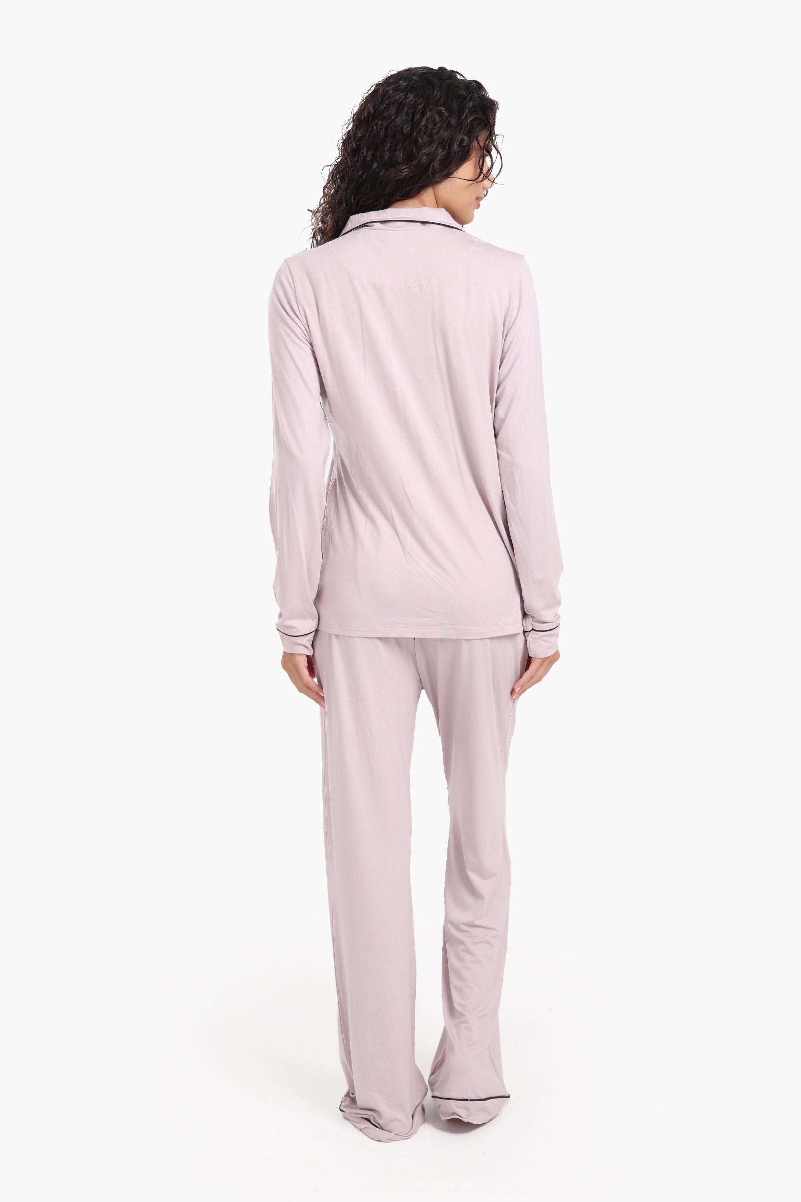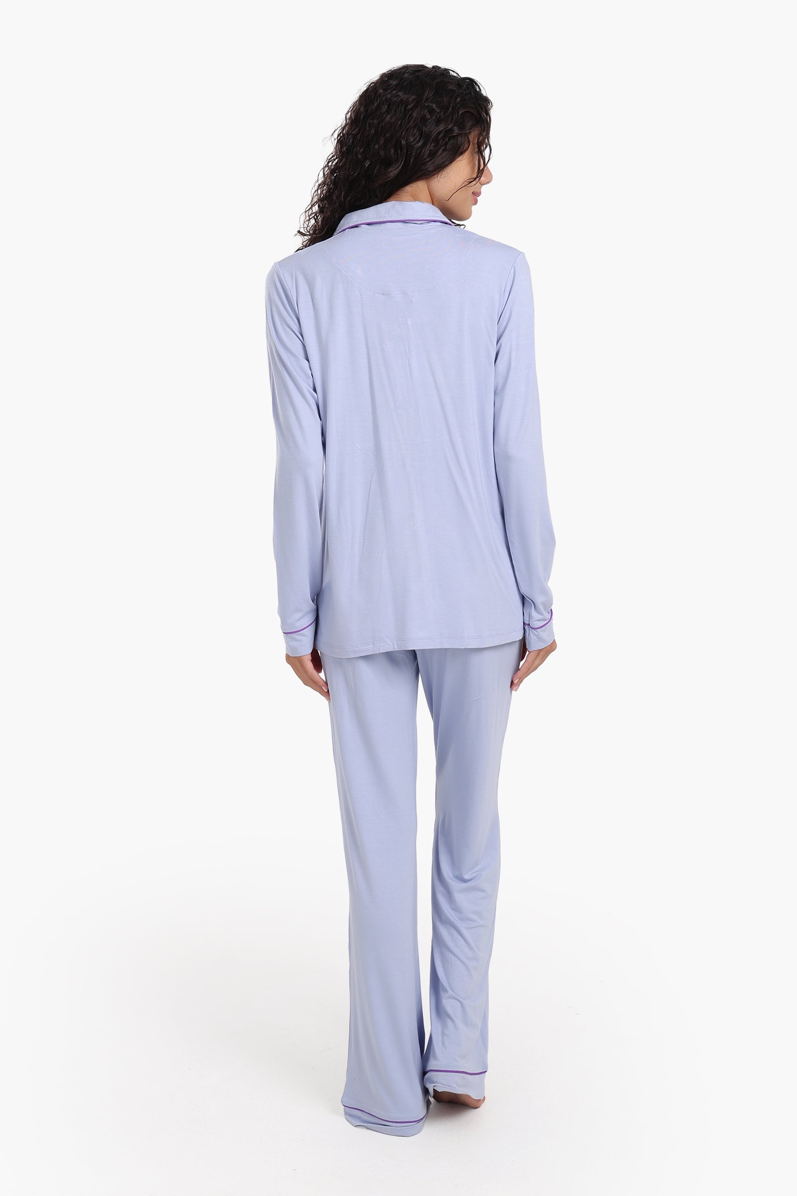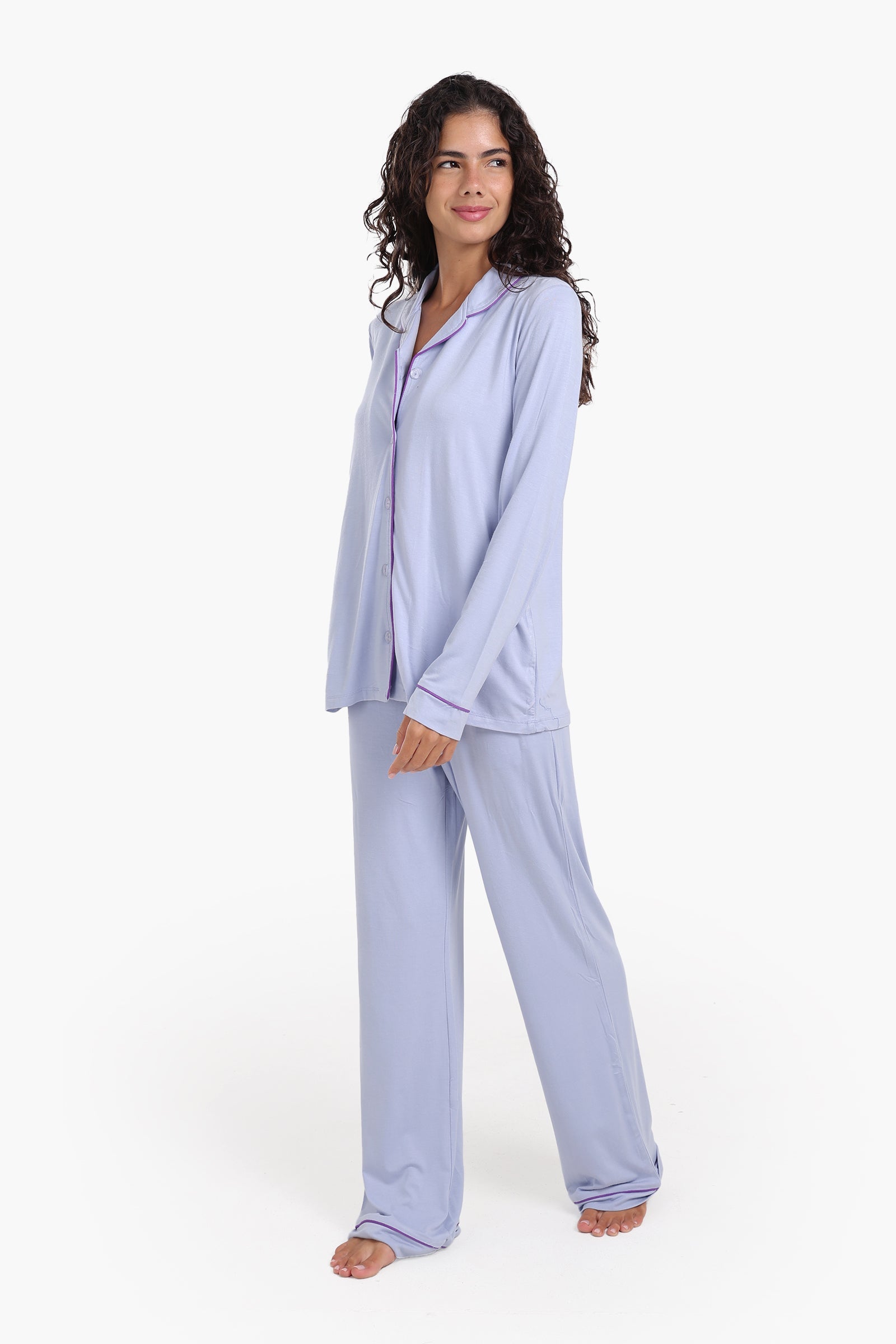 This elegant pajama set is crafted from soft and breathable viscose, offering exceptional comfort for restful nights or lounging. Featuring a regular fit with a solid pattern accented by white piping, it exudes a timeless, sophisticated style. The top boasts a notch collar, button-down closure, and long sleeves, making it as stylish as it is functional. The pants feature an elastic waist, straight cut, and side pockets for added convenience, while the full length ensures a cozy fit. This set is easy to wear and perfect for both lounging and sleepwear.